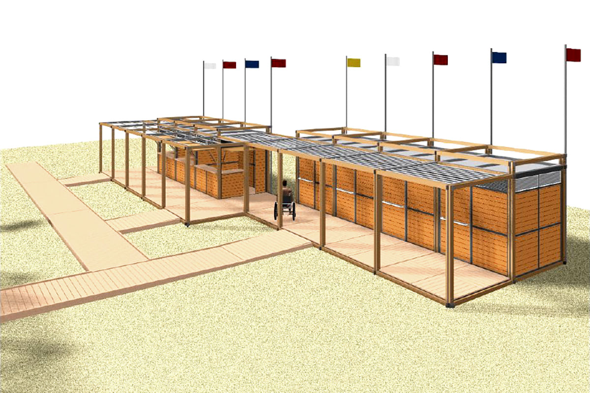 TETRAGON designed a flexible system of assembled, lightweight wood and metal constructions with indoor and outdoor spaces that served as canteens, changing rooms, ancillary areas, pergolas and visitor walkways, including infrastructure for Disabled People.