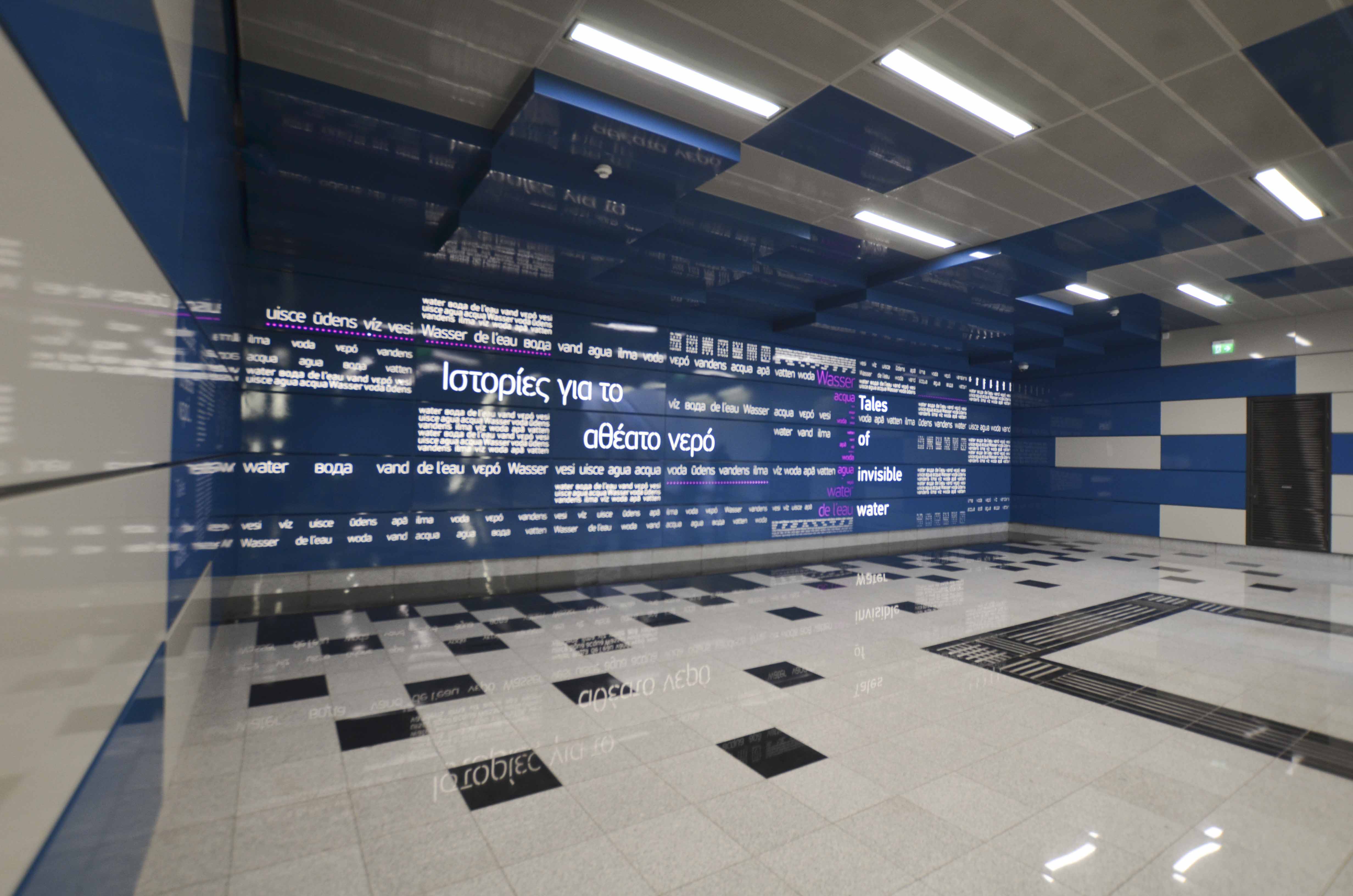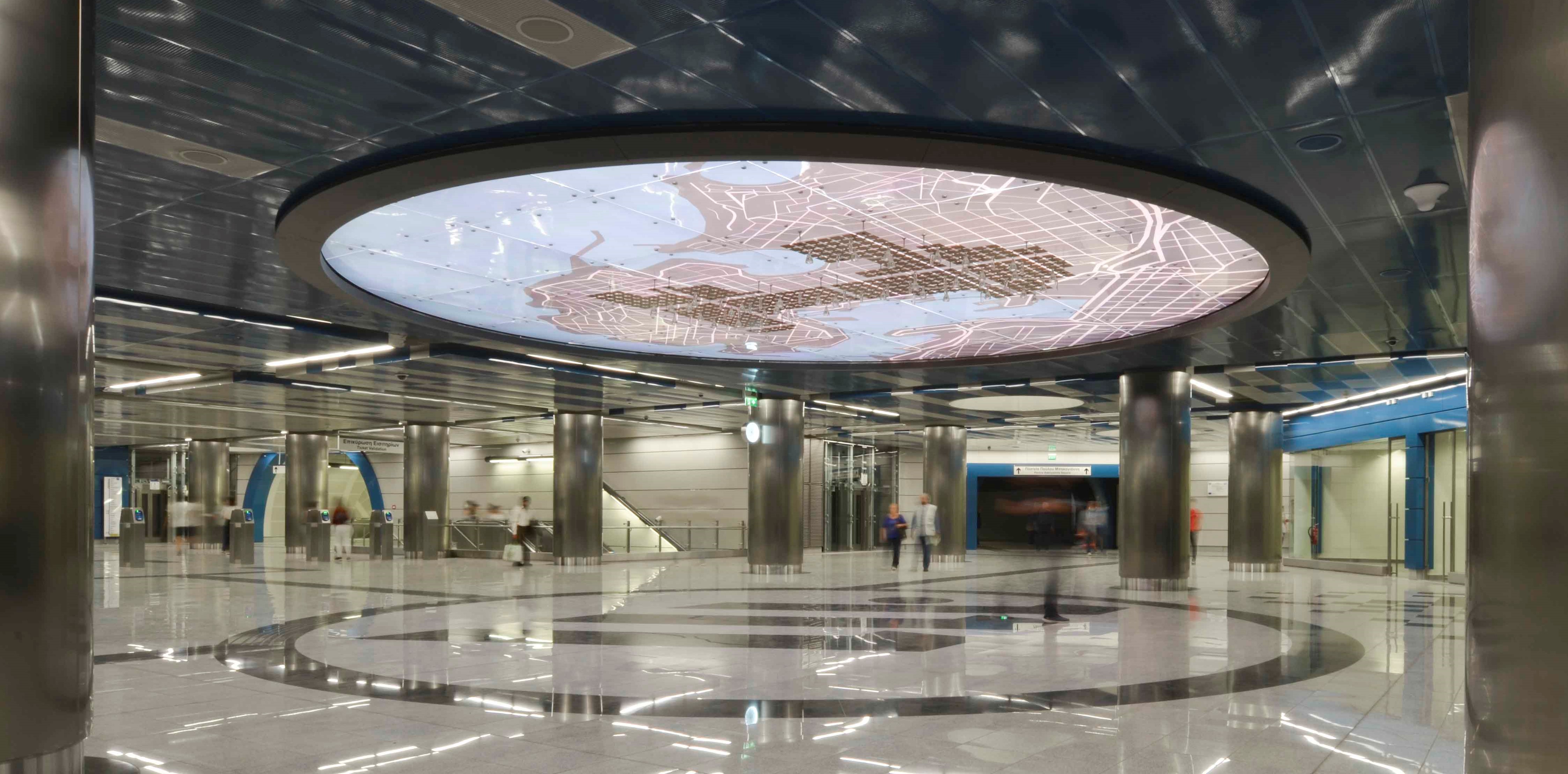 The Municipal Theatre of Piraeus metro station is the terminal station of Line 1 of Attica's metro network. From the blue colour that dominates the station, to the huge H2O and the narration of the importance of water in ancient Greece, even the impressive map placed strategically at the station's ceiling, the water element dominates visually and conceptually.